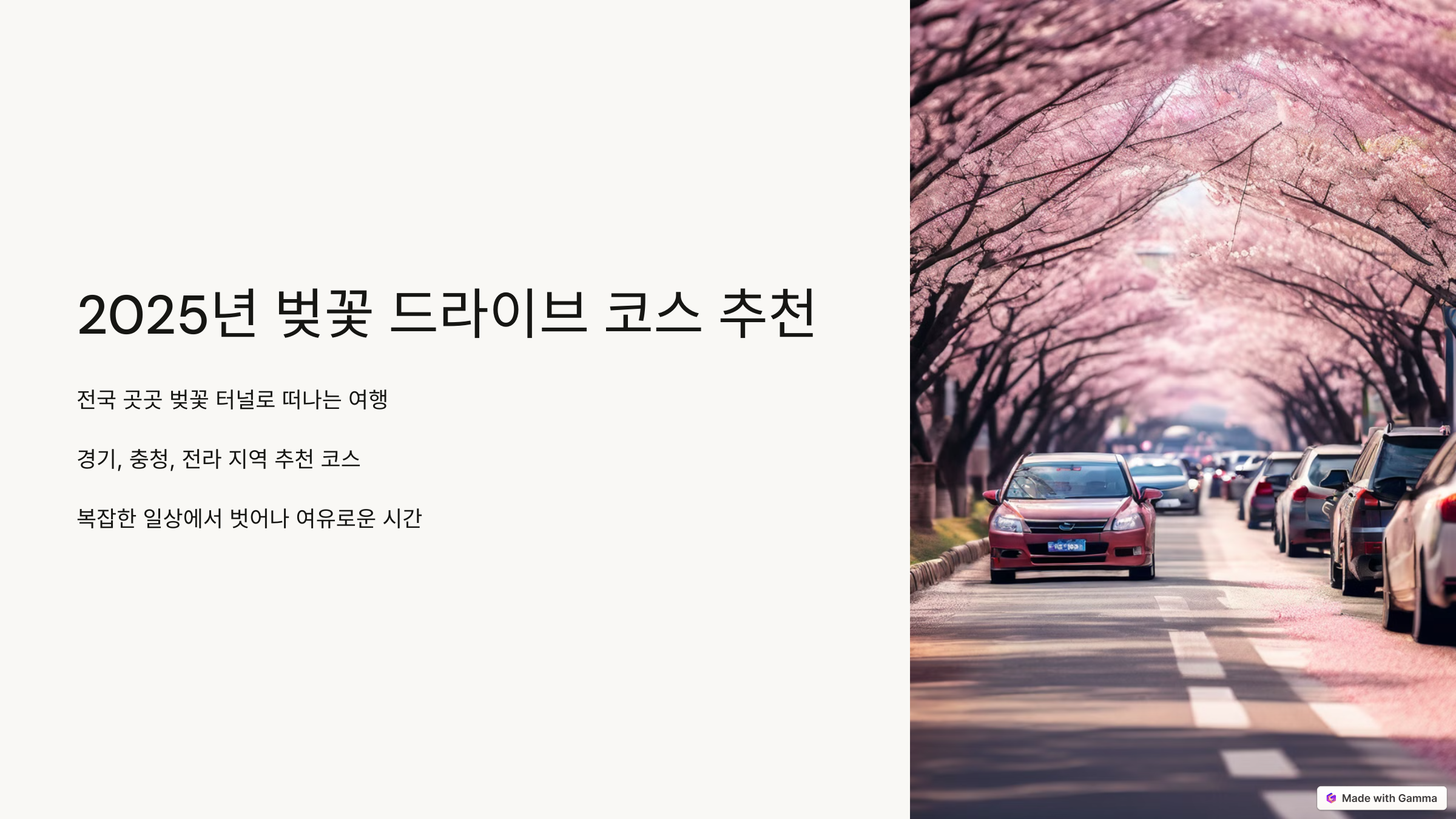 올해는 드라이브를 하며 벚꽃을 즐기며 잊지 못할 봄날의 추억을 만들어보세요!